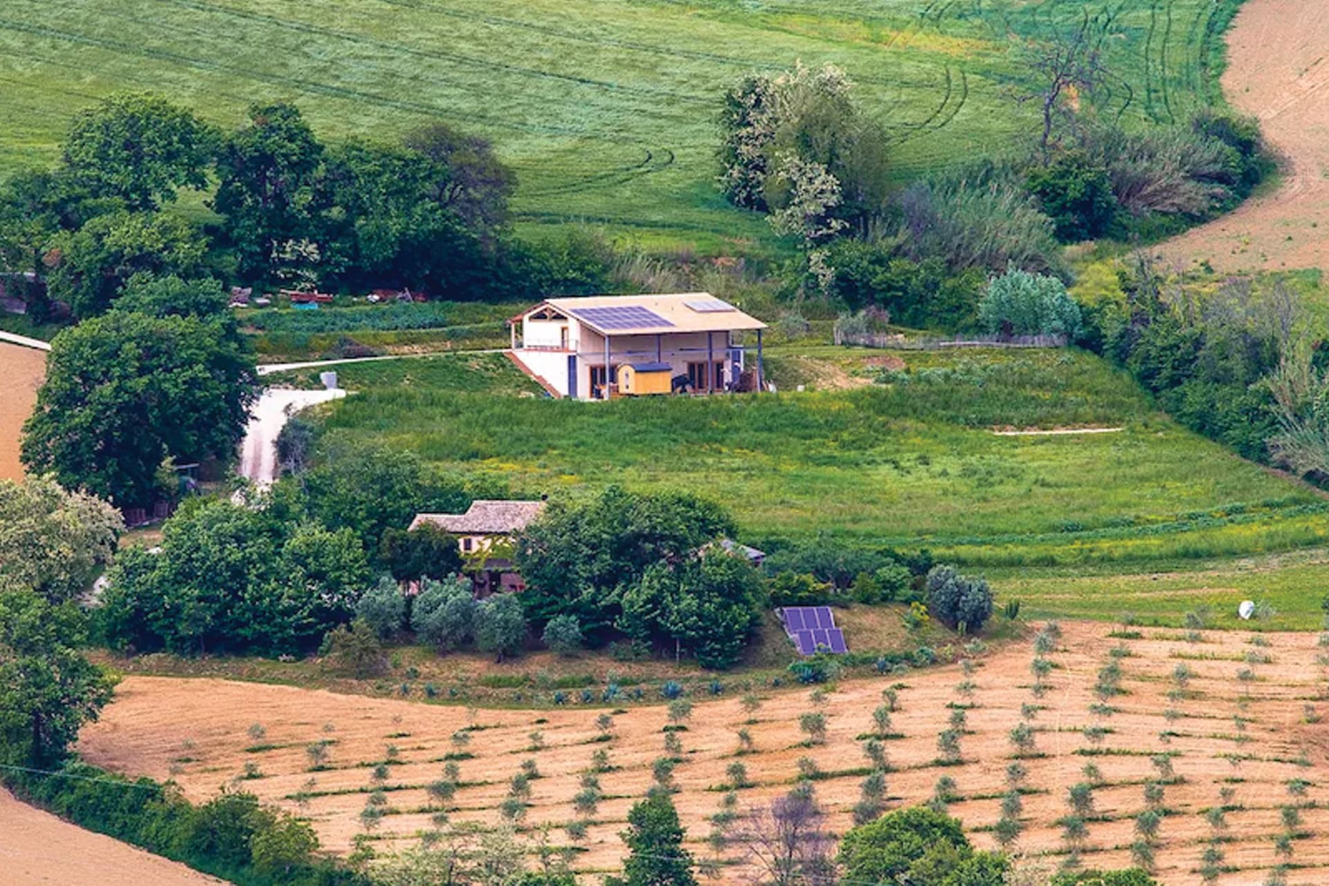 Nella primavera 2007 abbiamo acquistato un vecchio casolare marchigiano, con cinque ettari di terreno, nelle vicinanze di Barchi, a 30 km dalla costa adriatica, nella provincia di Pesaro e Urbino, sulle colline tra la Valle del Metauro e quella del Cesano. La ristrutturazione del casolare e della casetta adiacente è stata realizzata secondo criteri di bioedilizia. Gli edifici sono intonacati a calce mentre le pitture e le finiture interne sono ecologiche. Una parte degli edifici è costruita con balle di paglia e strutture in legno. Per produrre elettricità e acqua calda, sfruttiamo l’energia solare attraverso sia pannelli termici solari sia pannelli fotovoltaici. Inoltre, nei mesi invernali, riscaldiamo con una caldaia a legna per essere totalmente autosufficienti. Le stanze sono illuminate dalla luce naturale che entra da ampie finestre e portefinestre che si aprono sul nostro giardino e la campagna. Il terreno che circonda le case è coltivato secondo i criteri dell’agricoltura biodinamica e produce frutta e verdura, cereali e olivi con certificazione bio. Abbiamo costruito un biolago balneabile dove l’acqua non è trattata né con cloro né con altri agenti chimici poiché provvista di un sistema di fitodepurazione. Nelle vicinanze si trova un edificio agricolo, costruito nel 2013, costruito in balle di paglia, legno, argilla, calce e tadelakt.