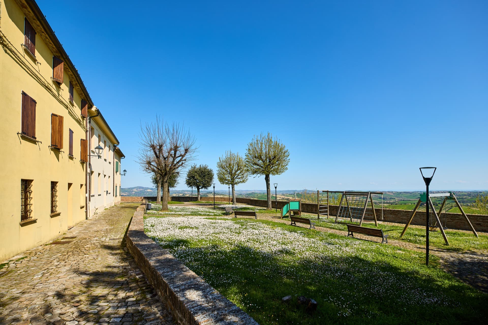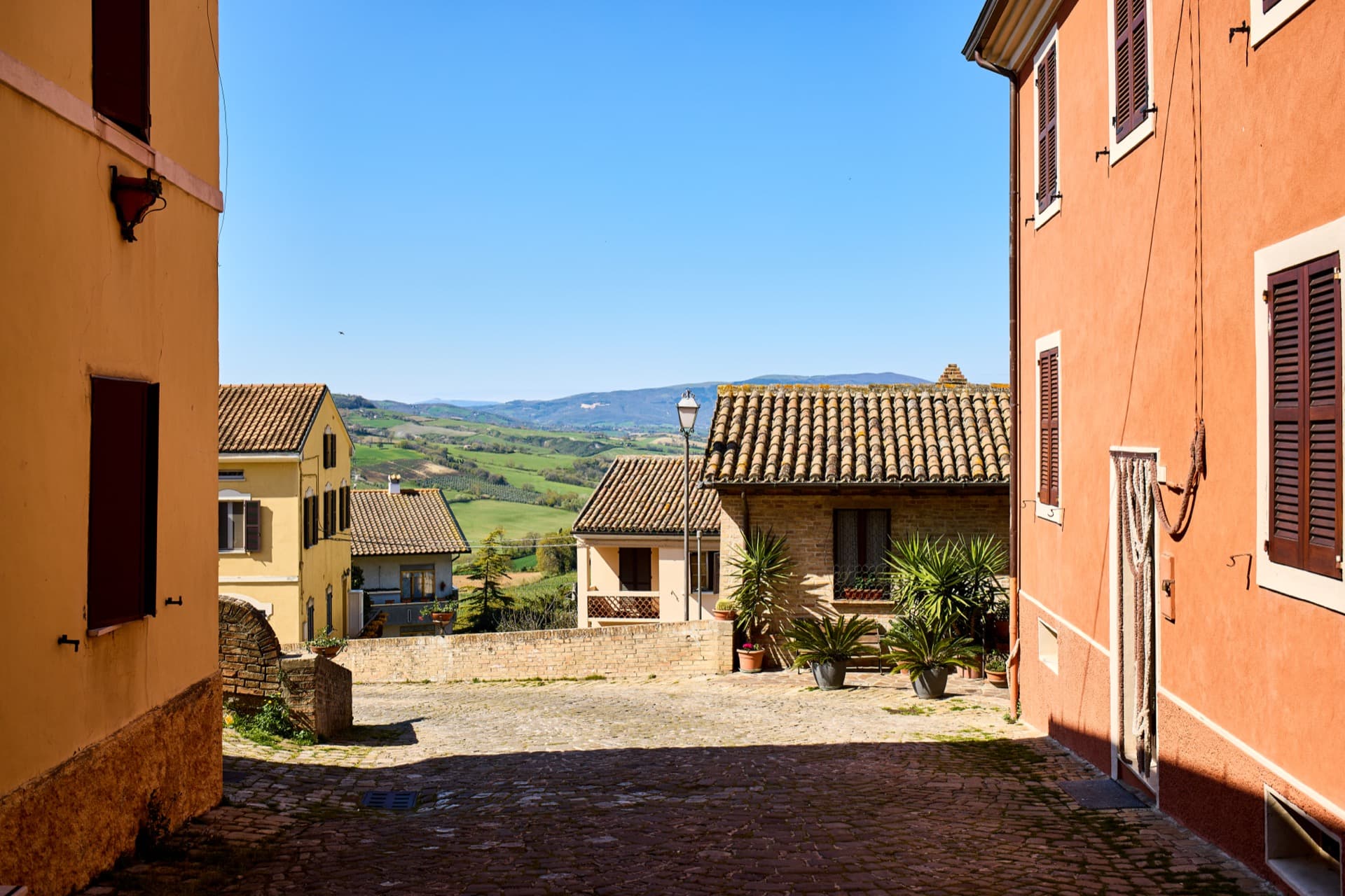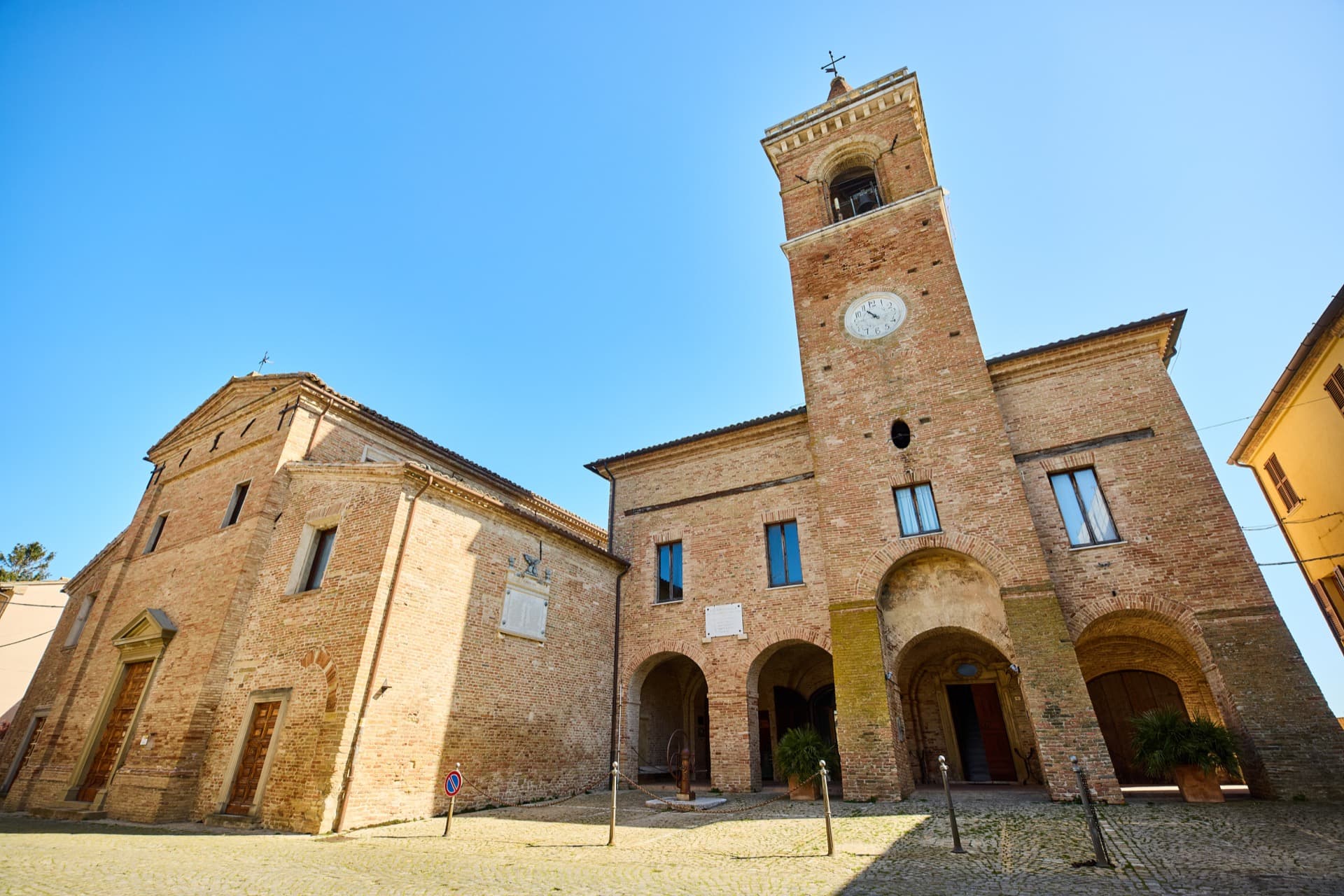 Lungo la strada, quasi inaspettato, sulla sommità di un crinale si incontra quel gioiello architettonico che è Barchi. Una rampa in salita conduce alla Porta Nova, monumentale e fastoso ingresso trionfale al castello, foriero della bellezza che si trova all’interno delle antiche mura. La pianta strutturale della cittadina rinascimentale porta la firma del bolognese Filippo Terzi, grande architetto dei Duchi di Urbino e quindi dei Reali di Spagna e Portogallo, che lavorò alla progettazione di una piccola “Città Ideale” del Rinascimento. A partire dal 1571, per volere del Marchese di Barchi Pietro Bonarelli, Filippo Terzi riprogettò l’intero abitato come se si trattasse di un’unica opera d’arte, arricchendolo di monumenti, di sontuosi palazzi e di efficaci soluzioni di difesa militare. La Torre terminante a cuspide che domina sull’intera vallata fu costruita in forme antropomorfe, con sorprendenti effetti ottici, nel rispetto dei concetti della “divina proporzione” e della volontà del nuovo Signore di imporre la propria autorità anche attraverso l’aspetto urbanistico e architettonico. Barchi resta uno dei rarissimi esempi di Città Ideale non rimasta sulla carta o nei sogni degli artisti rinascimentali, ma divenuta realtà. L’elegante Corso taglia l’intero abitato con la Piazza al centro, luogo del mercato e fulcro della cittadina, sulla quale si affacciano gli edifici rappresentativi dei principali poteri dell’epoca, il Palazzo Comunale con la torre, il Palazzo dei Duchi di Urbino e la Collegiata di Sant’Ubaldo. La chiesa, è di antichissime origini; la qualità dei materiali utilizzati e delle opere d’arte conservate al suo interno, ne fanno una sorta di magico specchio temporale, che riflette l’immagine di Barchi dei secoli passati e soprattutto del Rinascimento quando la cittadina e le nobili famiglie che la governavano vissero il periodo di maggior splendore. Costruita a tre navate, con la centrale più elevata, ospita sugli altari laterali pregevoli opere pittoriche, alcune delle quali di scuola baroccesca: Crocifissione con i Santi Ubaldo e Francesco attribuita a Nicolò Martinelli, detto il Trometta; San Michele Arcangelo che abbatte Lucifero di Francesco Allegrini; La Vergine, Santa Maria Maddalena e San Francesco, probabile opera giovanile di Giovan Francesco Guerrieri, al tempo in cui il padre Ludovico era podestà di Barchi; L’Annunciazione con Sant’Antonio abate di Antonio Cimatori, detto il Visaccio (bozzetti preparatori della tela sono conservati al Louvre di Parigi e al museo della Harvard University di Cambridge); La Resurrezione con Sant’Ubaldo e San Tommaso d’Aquino, pala del Visaccio collocata sopra l’altare del presbiterio. La cantoria sopra la bussola d’entrata racchiude il prezioso organo del 1786 opera del maestro veneto Gaetano Callido, massimo esponente della scuola organaria neoclassica settecentesca. Una piccola strada in salita, all’apparenza anonima, a Barchi può farci trovare di fronte a luoghi intrisi di storia e leggenda, come il Palazzo Ducale, che fu abitato dai duchi e principi della casata roveresca, dalla duchessa Eleonora Gonzaga al Cardinal d’Urbino, dal duca Guidubaldo II al figlio Francesco Maria II, e dal quale parte uno dei tanti cunicoli che disegnano un dedalo nel sottosuolo del paese. Non c’è angolo o prospettiva lungo tutto questo borgo che non offra un momento di stupore.
