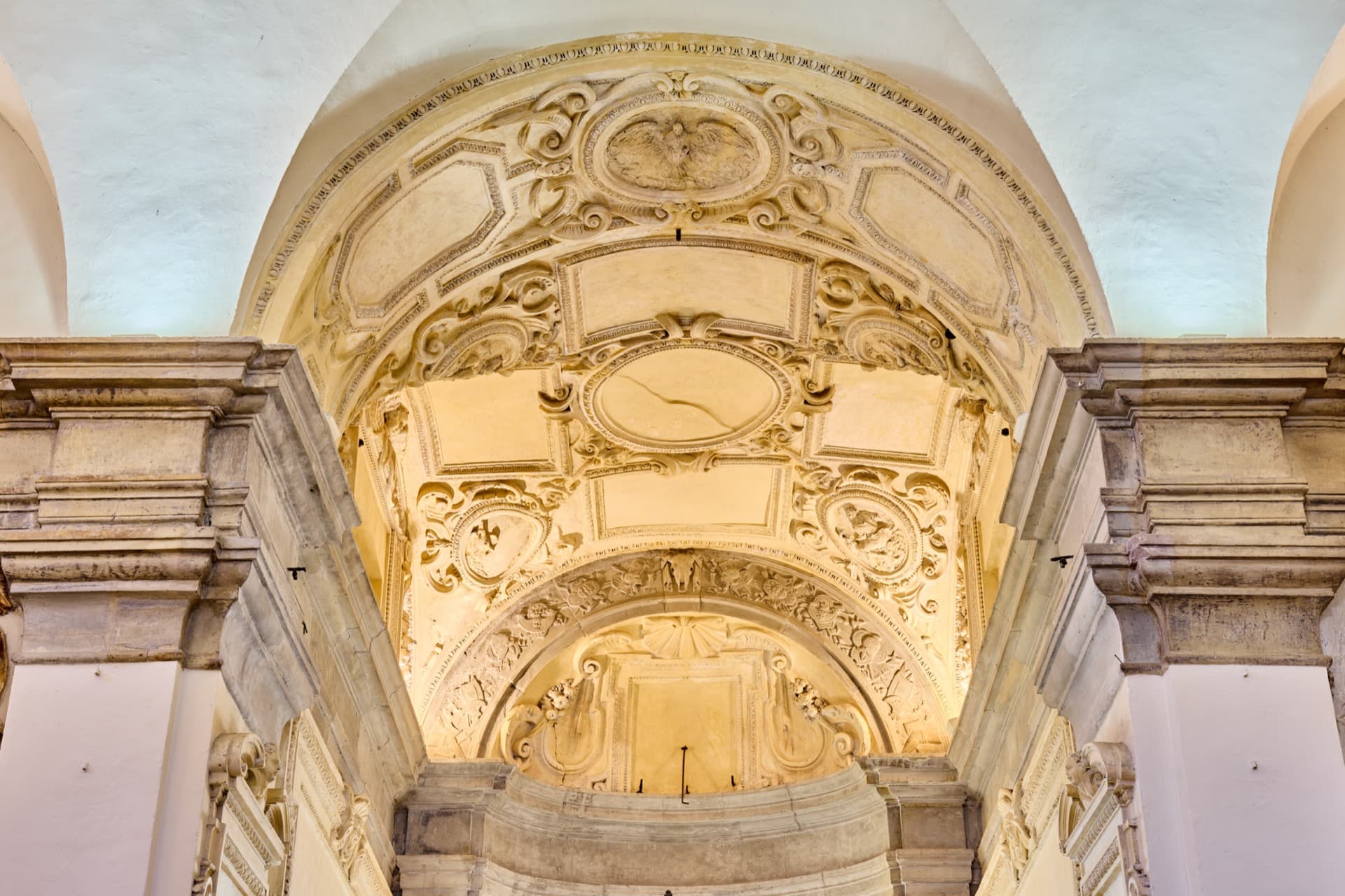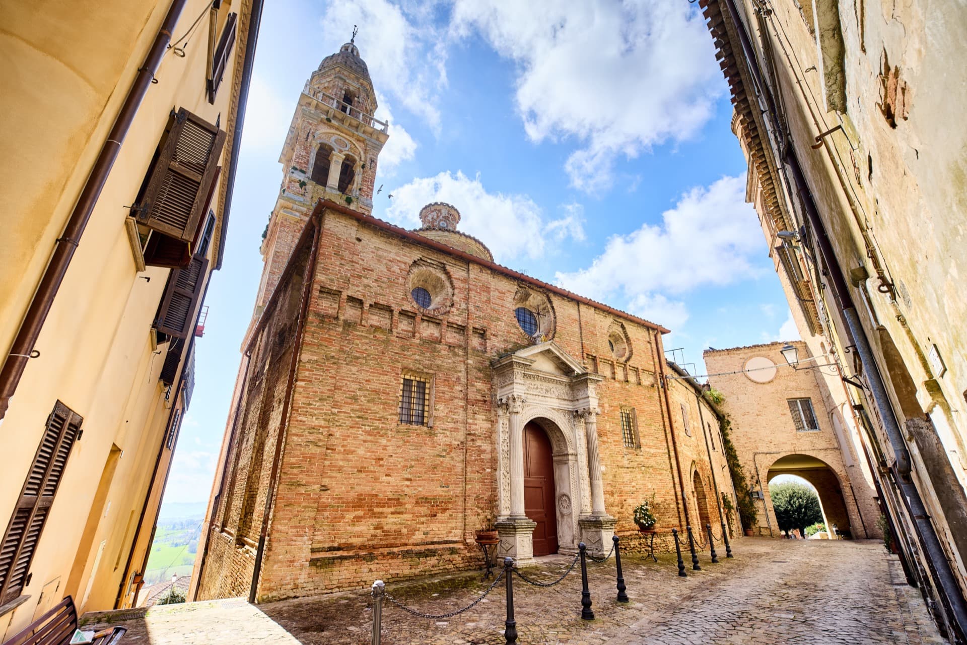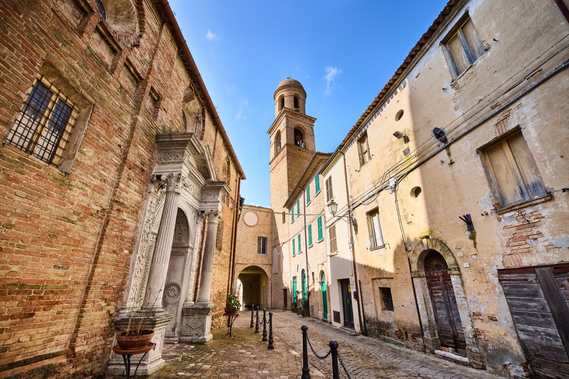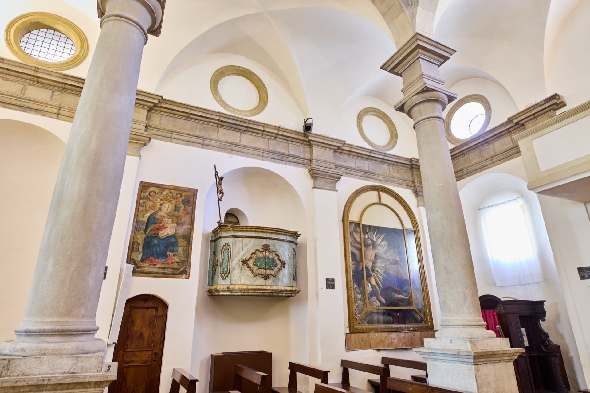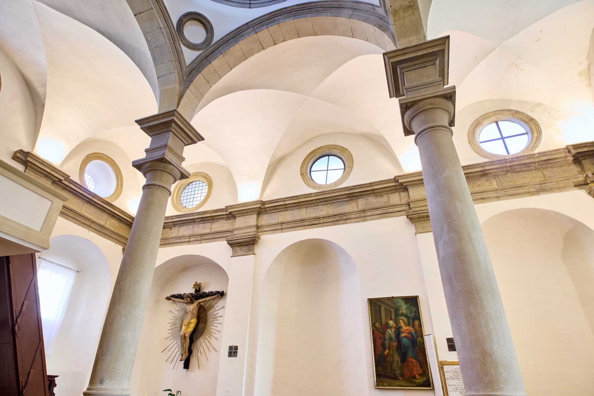 SANTA MARIA NUOVA – Eretta nel 1492 per volere di Giovanni Della Rovere su progetto dell’architetto fiorentino Baccio Pontelli, è il cuore prezioso del centro storico di Orciano. L’ingresso della chiesa è ornato da un prezioso portale scolpito in pietra bianca a forma di tabernacolo, poggiante su due eleganti colonne scanalate a capitelli corinzi e preziosi fregi in bassorilievo, che danno la sensazione di entrare in un antico tempio greco. Anche se non esistono documenti al riguardo, la tradizione vuole che nel disegno del portale ci sia la mano di Raffaello Sanzio di Urbino. L’interno della chiesa è sobrio ed elegante, con il delicato intonaco bianco e il curioso gioco di oculi ciechi e aperti distribuiti sulla cupola e sulle volte; notevole interesse destano le pregevoli decorazioni in stucco eseguite dal plasticatore urbinate Federico Brandani. Nel 1766 il Papa Clemente XIII proclamò la chiesa di Santa Maria Nuova “Basilica Collegiata”.